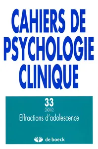 Effractions d'adolescence n° 33, 2009/2 - pagesPages 7 à 11ÉditorialPages 13 à 29Au dehors, le choc du dedansPar Aurélie LagarriguePages 31 à 41Passions adolescentes : la rencontre de corpsPar Jean-Luc Gaspard, Vera Lopes BessetPages 43 à 58Penser le geste suicidaire à l'adolescence et observer l'évolution à moyen-terme du fonctionnement psychiquePar Nathalie de Kernier, Jean Chambry, Patrick AlvinPages 59 à 68Quand la maladie entrave le travail du féminin de l'adolescentePar Stéphanie Poumeyrol, François MartyPages 69 à 84L'effraction du contre-transfert dans le psychodrame d'une adolescentePar Radu ClitPages 85 à 100L'adolescence : de l'héritage familial à la liberté individuellePar Véronique WenderickxPages 101 à 120Adolescentes placées : un féminin bien singulier ?Par Marine SchmollPages 121 à 138Le rapport au savoir de deux jeunes scolarisés en ITES : l'impossible intériorité et la mise au défiPar Françoise HatchuelPages 139 à 158Du site au lieuPar Élisabeth Duchêne, Emmanuelle Paul, Celestina Fanara, Annick Delférière, Hassan Samii, Tanguy de FoyPages 159 à 175Effraction et nom à l'adolescence : le tatouagePar Orsola Barberis, Silvia LippiPages 177 à 200L'adolescence en exil, exil d'adolescencePar Alexia Jacques, Soumaya Lamjahdi, Alex LefebvrePages 201a à 215aComprendre Freud, Jacques Sedat, Armand Colin, Paris, 2008, 204 p., par Nicole STRYCKMANPages 201b à 215bDe l’adolescence errante. variations sur les non-lieux de nos modernités, Olivier Douville, Éditions Pleins Feux, coll. « L’impensé contemporain », 2007, 64 p., par Antoine MASSONPages 201c à 215cL’inentendu. Ce qui se joue dans la relation soignant-soigné, Philippe van Meerbeeck et Jean-Pierre Jacques, De Boeck, coll. « Oxalis », 2009, par Alex LEFÈBVREPages 201d à 215dViolences et agressivités au sein du couple, Sous la direction de Nathalie Frogneux et Patrick De Neuter, par Anne-Laurence COOPMAN et Christophe JANSSENPages 217 à 220Idéaux et idéalisations