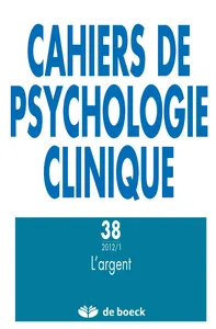 L'argent n° 38, 2012/1 - pagesPages 7 à 9ÉditorialPar Alex LefebvrePages 11 à 30Argent, cadre et psychanalysePar Luiz Eduardo Prado de OliveiraPages 31 à 49L'argent dans la cure au temps de FreudPar Jacques SédatPages 51 à 58Le prix du sacrificePar Jean-Claude AguerrePages 59 à 83Les impasses de la dernière nosographie freudiennePar Pascal MettensPages 85 à 102Le premier transfert : s'arracher à la suggestion du somatiquePar François VillaPages 103 à 114Une difficulté spécifique aux cures en cas d'hystérie : la nécessité de l'insatisfactionPar Patrick De NeuterPages 115 à 130Ceci n'est pas une tache. Réflexions autour d'une métaphore calligraphiquePar Alex LefebvrePages 131 à 159De l'épilepsie et du diabète comme modalités de traitement des pulsionsPar Sylvie AntoinePages 161 à 177H. I. et V., ou les lettres d'amourPar Vincent BourseulPages 179 à 202Construction de la limite interne et « bon usage du double interdit du toucher » dans des groupes thérapeutiques de jeunes enfantsPar Éric JacquetPages 203a à 207aLa question féminine de Freud à Lacan – la femme contre la mère, M. Zafiropoulos, coll. philosophie d’aujourd’hui, PUF, Paris, 2010, par Marina KoussouriPages 209b à 211bLa dignité de penser, Roland Gori, éditions LLL, Paris, 187 pages, 16 euros, par Marie-José Del VolgoPages 113c à 215cLes enfants et l’alcoolisme parental, Sous la direction de Blandine Faoro-Kreit, Préface d’Albert Ciccone, Postface de Jean-Paul Roussaux, Erès, collection « La vie de l’enfant », Toulouse, 2011, 292 p., par Mimi ArmstrongPages 217d à 222dLumière des astres éteints, la psychanalyse face aux camps, de Gérard Haddad, par Patrick De NeuterPages 225 à 227Formation et enseignement