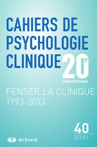 Penser la clinique 1993-2013 n° 40, 2013/1 - pagesPages 7 à 10Éditorial. Penser la clinique 1993-2013Par Liliane DirkxPages 11 à 28Des passages : temps, espaces, pratiques et croyances : 1993-2013Par Bernadette Grosjean M.D.Pages 29 à 45Diversité et complexité des pratiques cliniquesPar René RoussillonPages 47 à 69L'extension de la psychanalysePar René KaësPages 71 à 87Deux décennies de recherche en neuroscience : avancées et perspectivesPar Serge N. SchiffmannPages 89 à 120Genèse et enjeux épistémologiques de la psychologie clinique périnatalePar Sylvain MissonnierPages 121 à 150L'autisme en vingt ans...regards de deux pédopsychiatres aux pratiques cliniques différentes...Par Cécile Vander Vorst, A. WintgensPages 151 à 164De la symbolisation primaire à la symbolisation secondairePar Bernard GolsePages 165 à 180Réflexions sur le statut de l'analyste dans la cure des adolescentsPar Philippe GuttonPages 181 à 203L'audacieuse clinique du couplePar Danielle Bastien, Christophe JanssenPages 205 à 216Thérapie de couplePar Robert NeuburgerPages 217 à 244Histoire et situations contemporaines de l'anthropologie cliniquePar Olivier DouvillePages 245 à 257Rencontre avec Siegi Hirsch pionnier de la thérapie familiale francophonePar Annig Segers, Claudio PiccirelliPages 259 à 262« Le transgenerationnel »